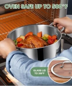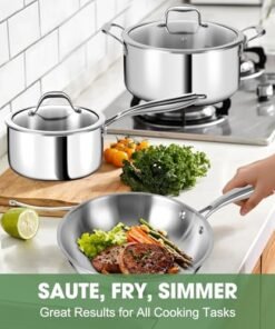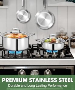 awesome pots and pans! heavy duty and sturdy. cooks evenly and cleans up nicely if you follow instructions on how to use stainless steel. i have each size that i need to cook for my family. i did my research on the different types of stainless steel to make sure they were a healthy cooking choice. i’m very happy with my purchase and feel great about the healthier stainless steel!