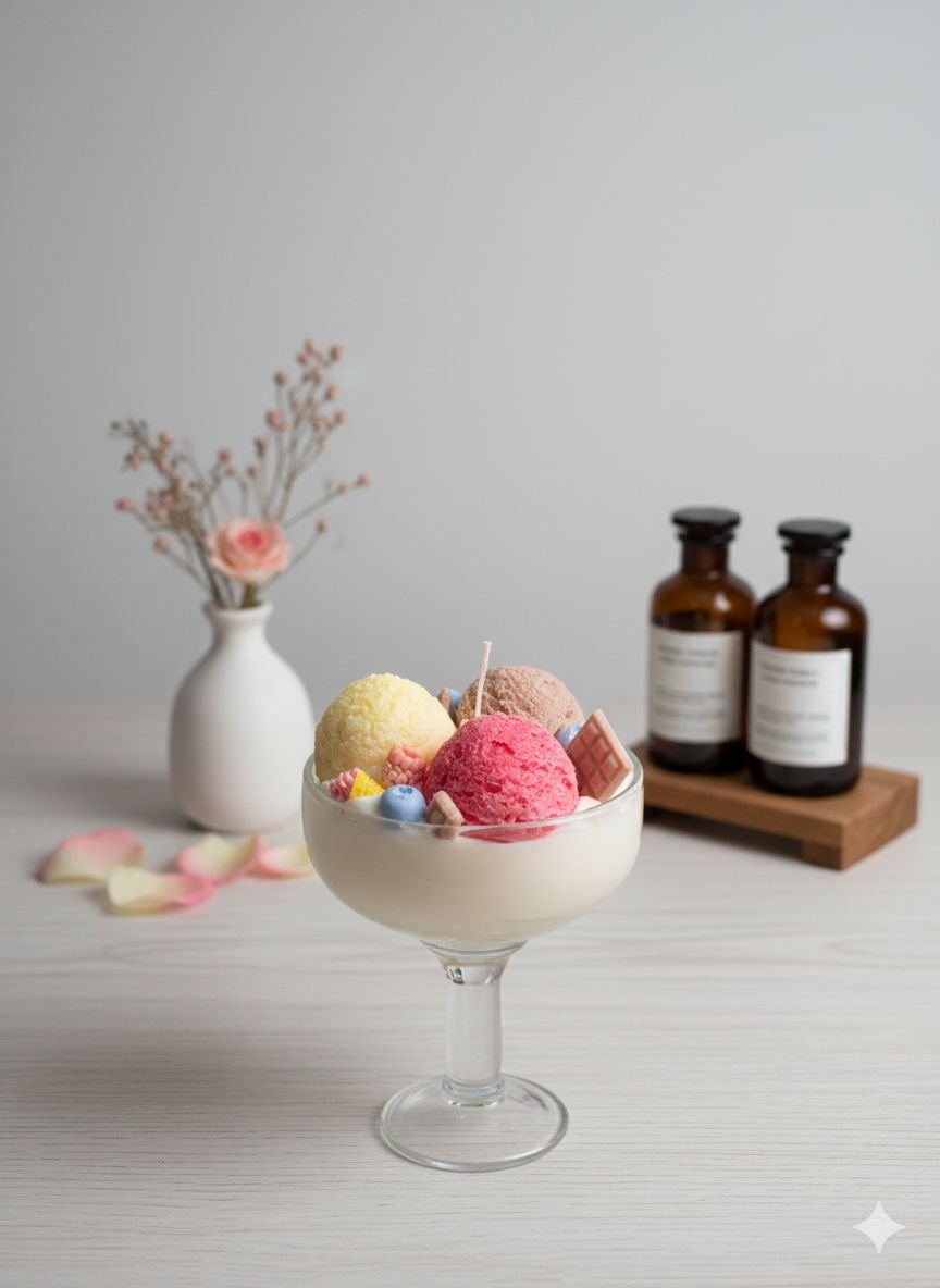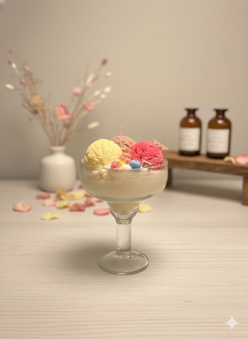 Esta vela artesanal en copa está inspirada en un delicioso postre de tres bolas de helado, cuidadosamente elaborada para ofrecer una experiencia visual y sensorial única. Está aromatizada con aceites esenciales que combinan notas de vainilla cremosa, chocolate suave, fresa dulce y marshmello, creando una fragancia envolvente y reconfortante.